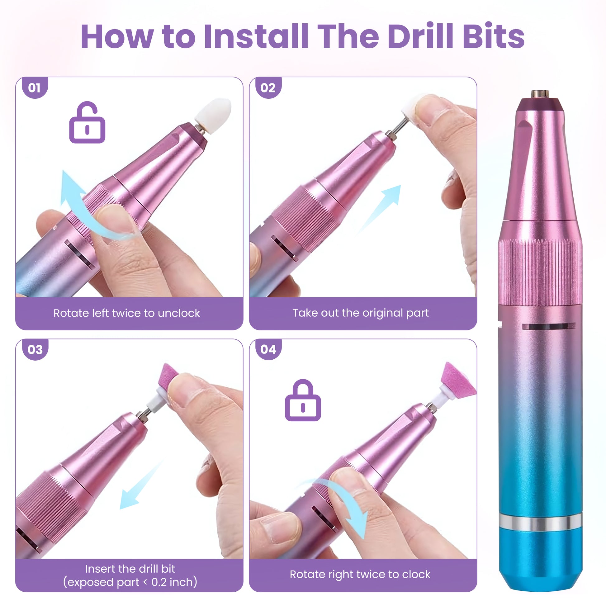 Discover the Nail Drill Kit, a powerful and precise electric nail file designed for both professionals and DIY enthusiasts. Featuring a robust motor with adjustable speed settings up to 35,000 RPM, this nail drill ensures you have complete control over your nail care routine. Its ergonomic design minimizes vibration and noise, providing a comfortable user experience. With a high-capacity battery lasting up to 12 hours, this portable device comes with 18 drill bits and 20 sanding bands, making it perfect for all your nail care needs.