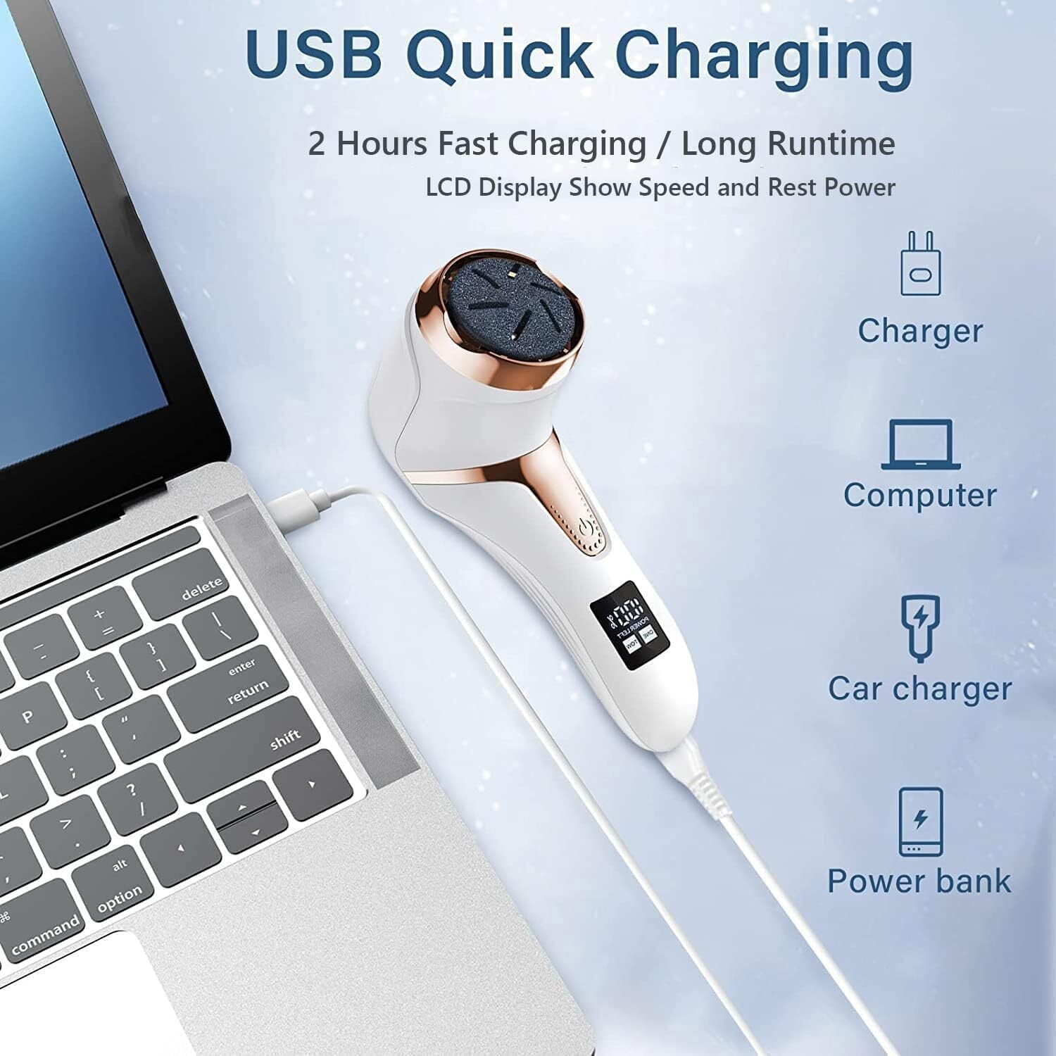 Rechargeable, Long-Lasting, Easy to Use:Included USB charging cable, This electric foot file can be charged via any USB port, and have a long runtime 2hours after full charged .and this dead skin remover for feet have LCD Power display let you clear know the rest power it left. remind you charge in time