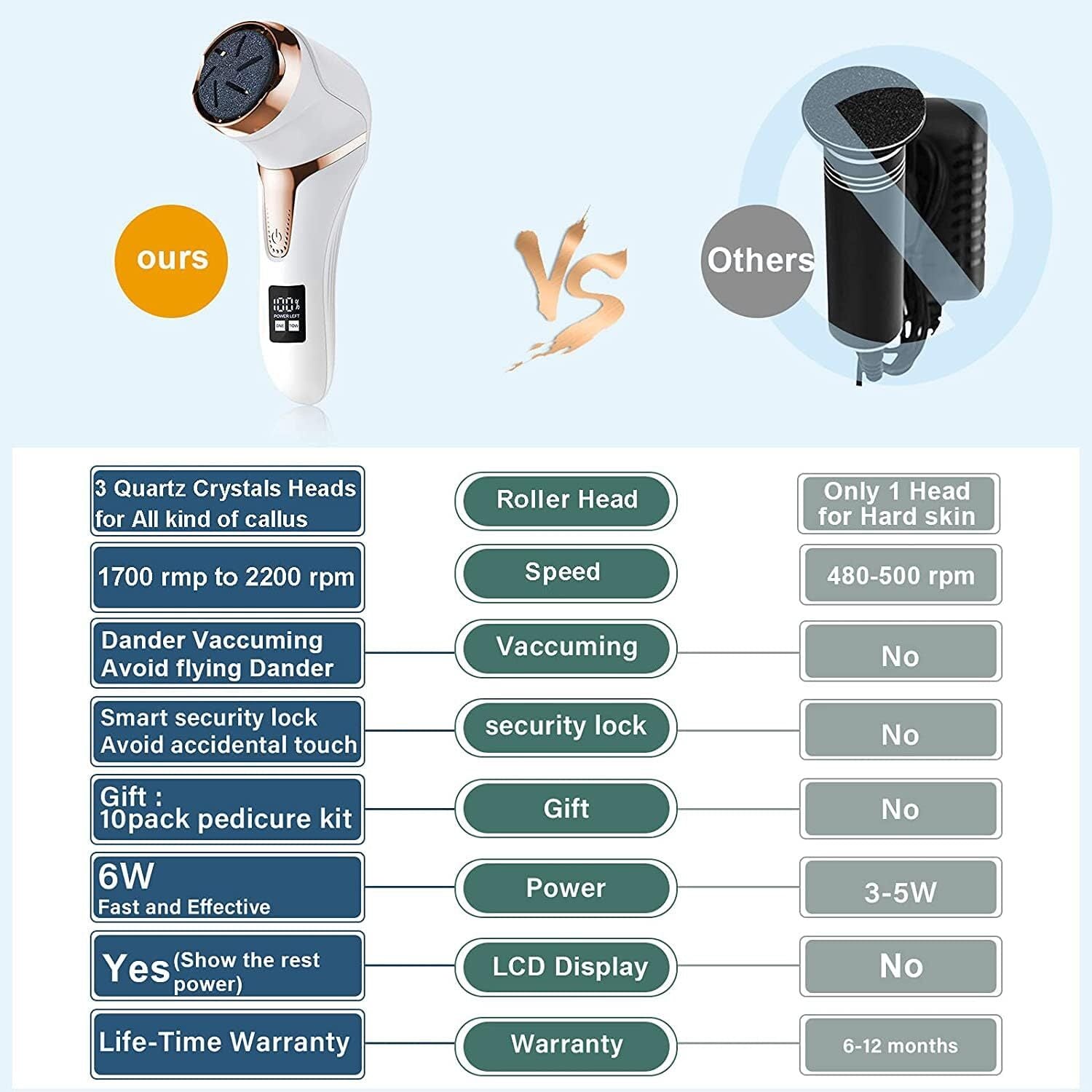 Pedicure kit with 3 Grinding Head, 2 Speed, with VACUUM ABSORPTION:3 Quartz Crystals Removable Roller Heads and 2 Speed Correspond to the roughness required to remove the calluses on the feet. UPGRADE powerful callus remover with dander vacuum cleaner quickly sucks away foot scraps, cle.an and hygienic, and sucks while grinding. dust-free, and foot scraps will not be scattered in air or floor, an essential home pedicure kit for people who has cleanliness.